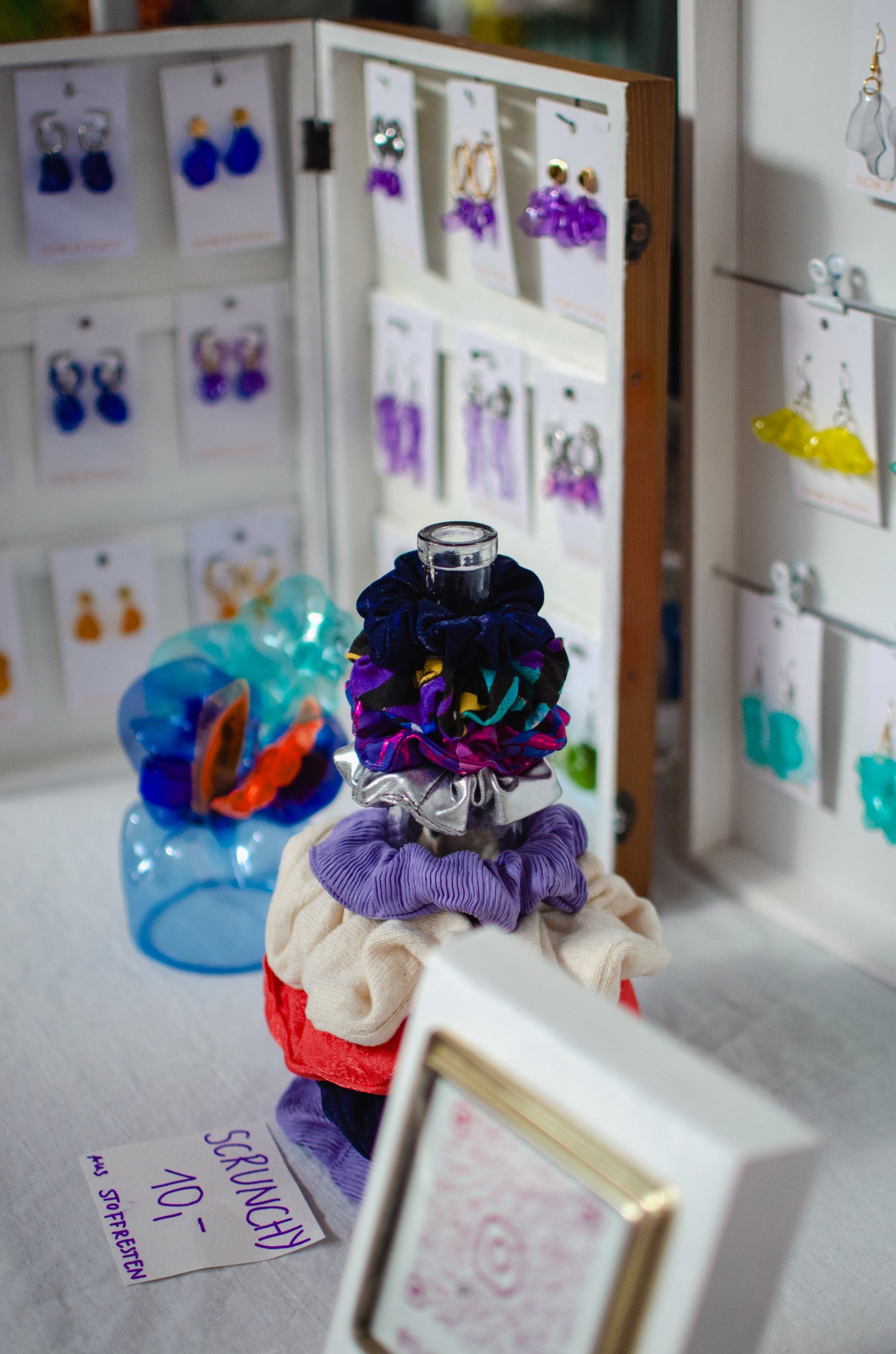 In unserem Atelier im Dresdner Zentrum entstehen fröhlich-farbige Unisex-Mode, Statementpieces und einzigartiger Upcycling-Schmuck. Produziert wird lokal, größtenteils made to order, mit einem Fokus auf Deadstock-Materialien. Besonders beliebt: unsere handgefertigten Ohrringe aus alten Plastikflaschen, die an Glas und Edelsteine erinnern.